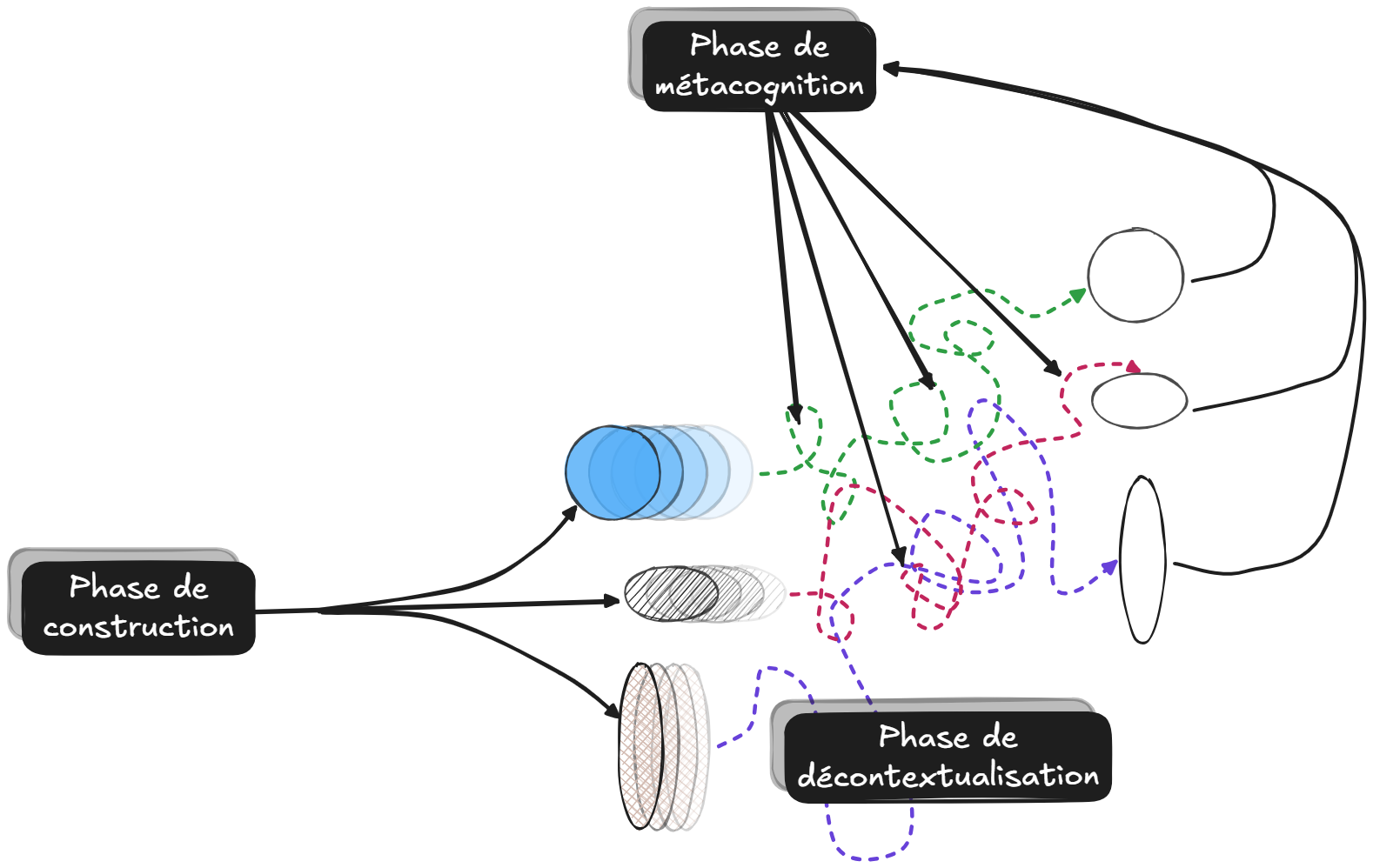- Troisième et dernier moment, la phase métacognitive ou réflexive pour expliciter le chemin cognitif suivi entre les multiples itérations du premier moment et la phase de décontextualisation.